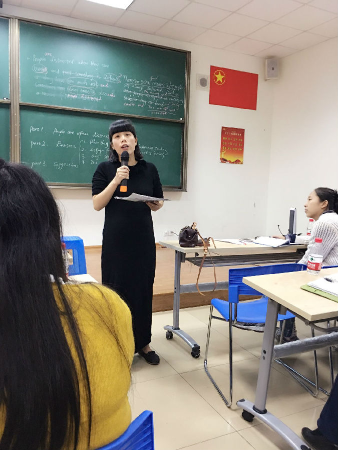 课后两位老师阐述了自己的备课思路。工作室助理张敏老师对这两堂课进行了综合点评。秀外慧中温文尔雅的张老师从更高的高度和更专业的角度肯定了这两堂课的优点,也提出了一些建议,如续写和概要写作时,我们更应从学生的角度思考,并且关注写作的速度、outline大纲、思维导图、topic sentences,让在座的老师们如沐春风,豁然开朗。