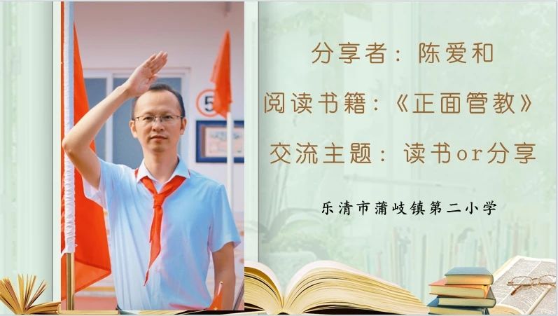 第一位分享者是来自乐清市蒲岐镇第二小学的陈爱和老师,交流的书目是《正面管教》。陈老师认为,读好书不仅仅是为了自己的提升,还应该分享给更多的人,宣传更多的研究内容。他们学校还将《正面管教》作为学校共读书目,推广到更多家长群体去。学校通过书本,将书本中的知识传递给家长。《正面管教》无疑是非常适合家校共育借鉴的书籍。