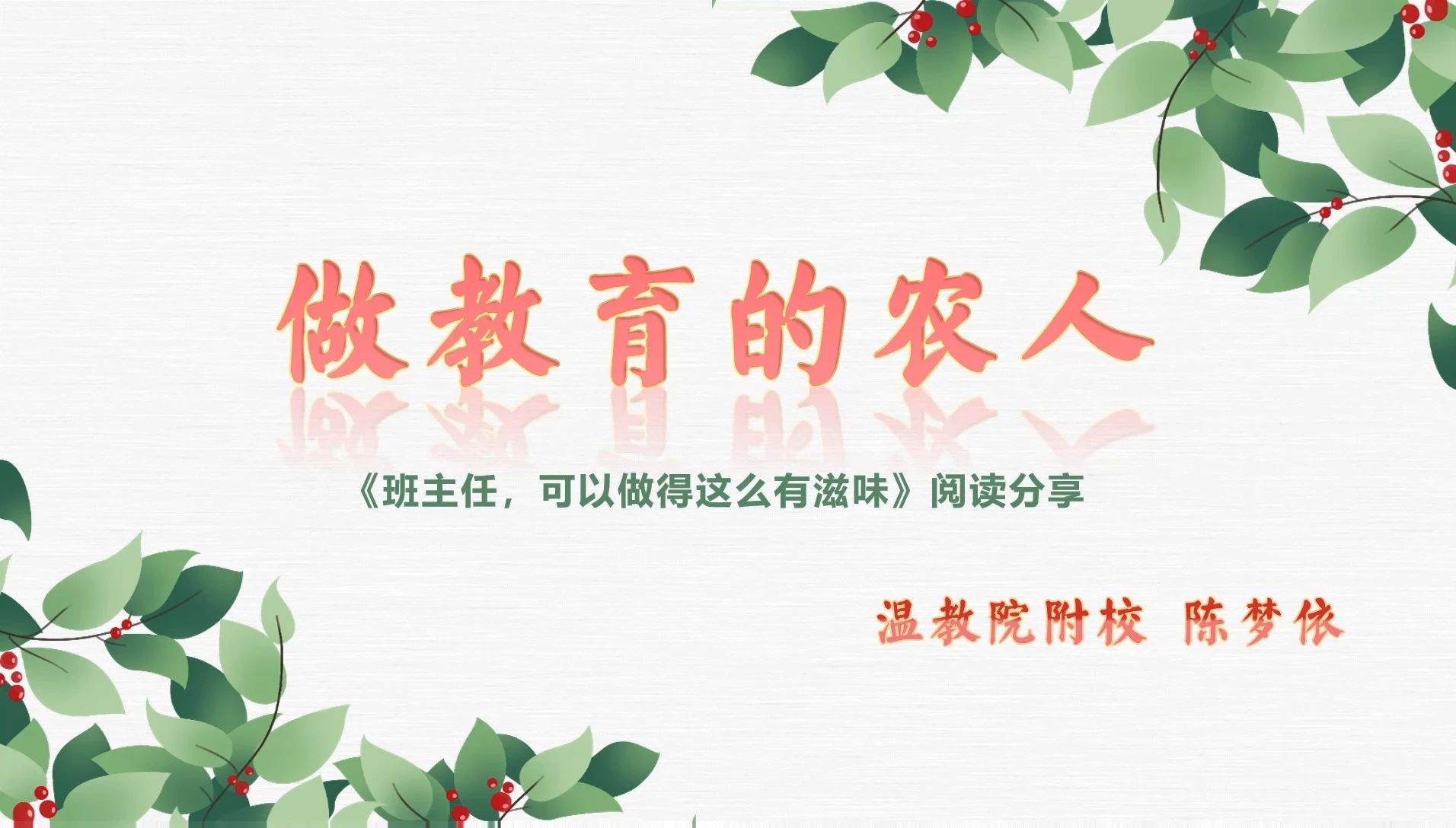 第二位分享者是来自温州市教师教育院附属学校的陈梦依老师,交流的书目是《班主任可以做得这么有滋味》。年轻的陈老师就如新时代的农人,在班主任工作中悉心劳作,在孩子们内心埋下积极向上的种子。她从以下几个方面阐述了如何将班主任做得有滋有味:与学生相处中体现语言智慧;“自助餐”式的惩戒明确了惩戒的有效性;与家长建立共育联盟,帮助孩子拔节成长。班主任工作是琐碎的,但是智慧的方式能让我们感受“班主任”的幸福。而我们也应成为悉心耕耘的“农人式”的班主任,在以后的工作中,要更关心日常教育,放慢自己的脚步,用心体会学生成长的点点滴滴,同学生一起成长。